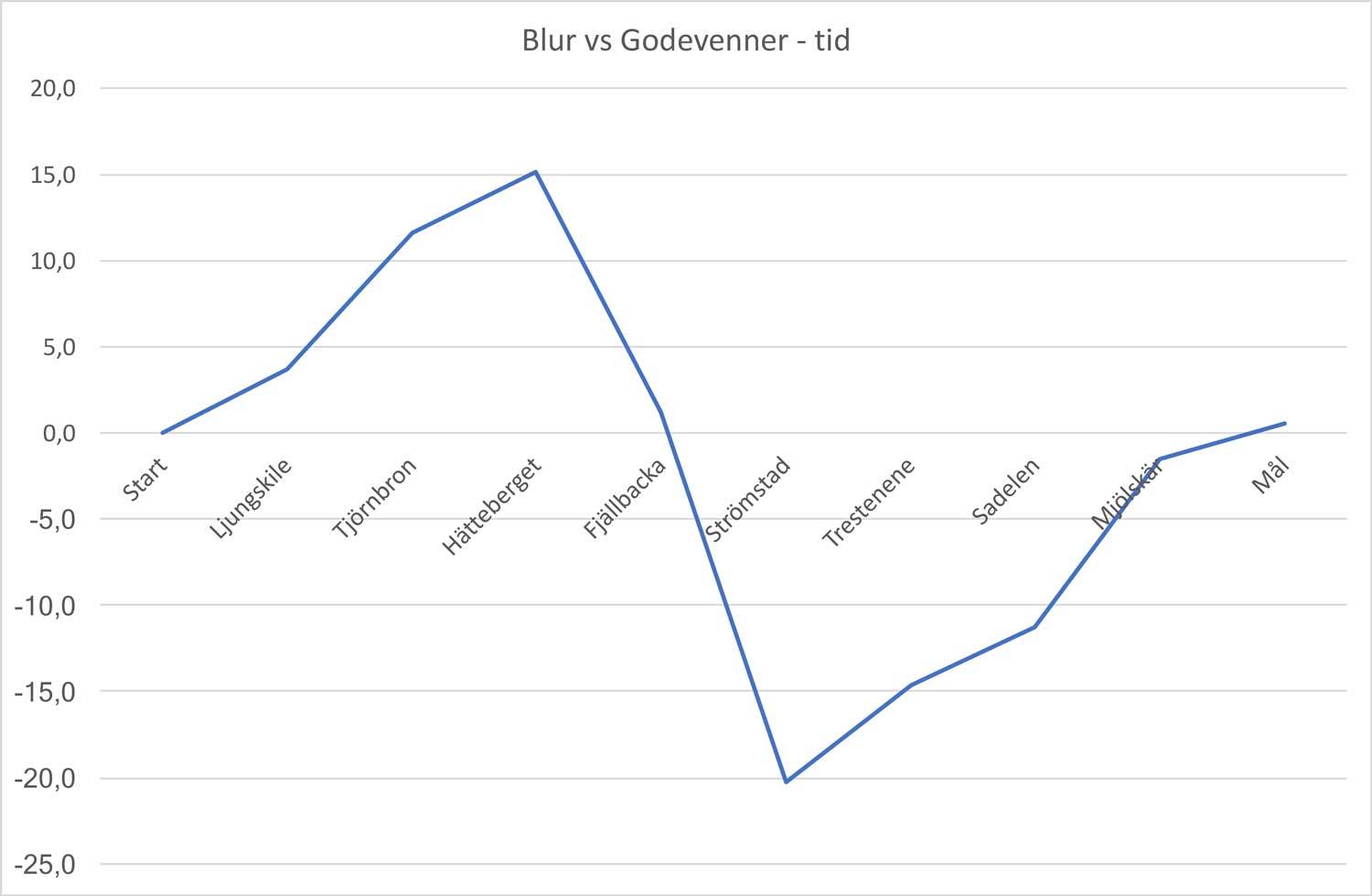 15 minuter före vid Hätteberget för att vara 1:15 före i Fjällbacka. Som mest 20:15 bakom i Strömstad innan vi börjar hämta tillbaka… För att till sist vinna med dryga halvminuten.