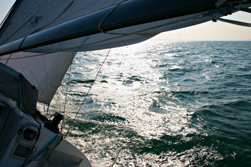 Första delen av sträckan var det motor men som senare stängdes av till förmån för ökande vindar. Full stor och genua och så bar det iväg. Vi visste att vi skulle vara tvungna att gippa vid Utklippan för att optimera spåret genom Kalmarsund och sjölä. Full fart upp mot Utklippan och vågorna och vinden började öka. Halvvägs ute på Hanöbukten fick vi riktigt bra fart i surfarna och Peter jagade ständigt fartrekordet som vid det här tillfället låg på 17,6 knop.