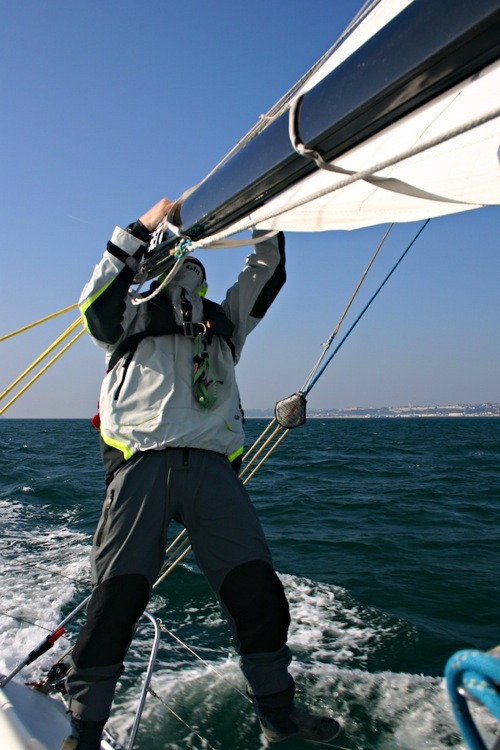 Vi ville helst ta gippen när det fortfarande var ljust men det mörknade snabbt och vi fick förbereda oss på en stagvändning med bara storseglet istället. Balansera ballasttankarna 50/50, rulla in genuan, förbereda backstagen och starta motorn för stöd om det inte gick att komma runt. Det blåste trots allt 34 knop ca 17 m/s vid tillfället.