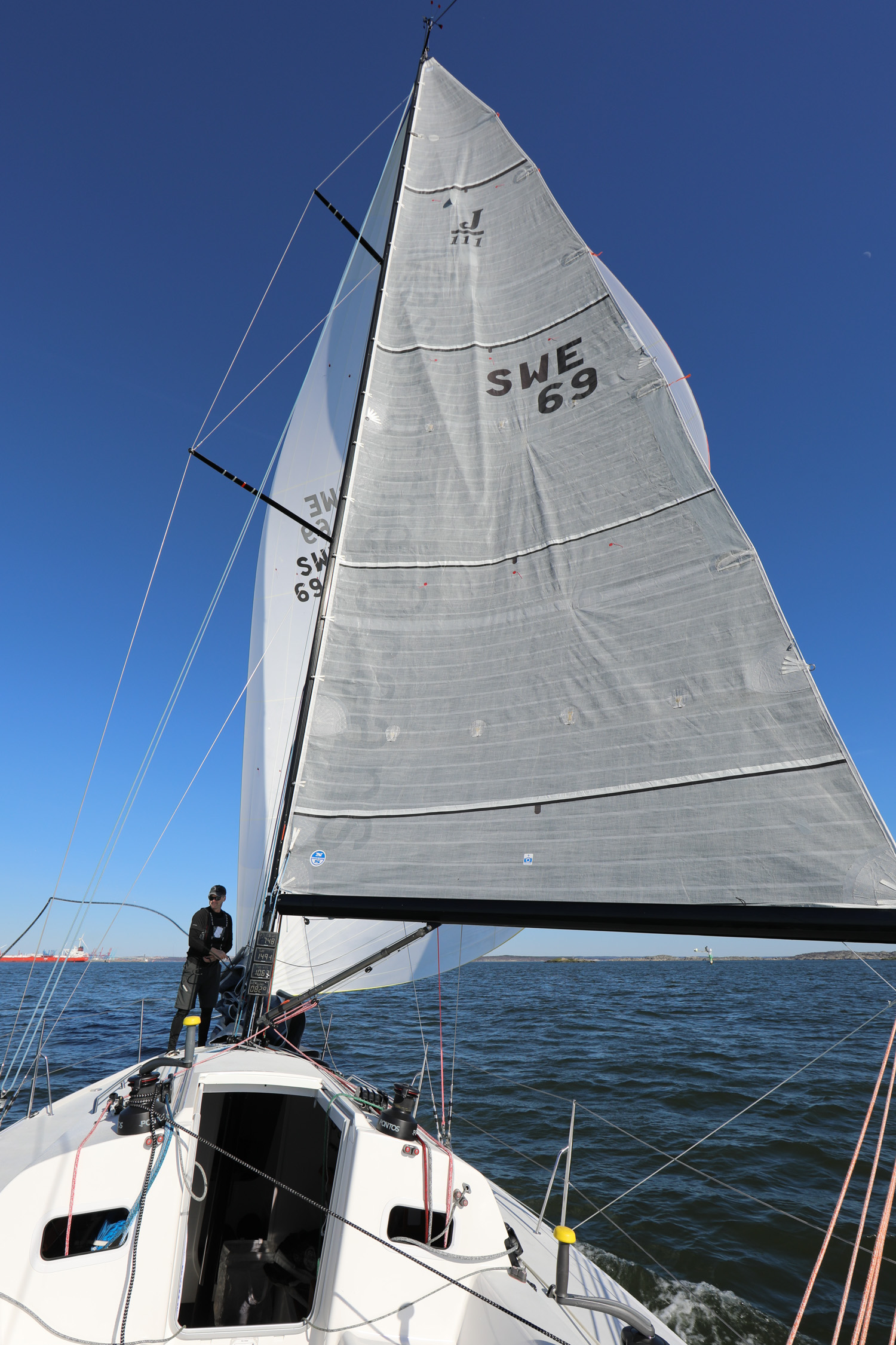 För en J111:a på 2 pers, 10kn vind, 185m2 segel, twa 140-155 och smult vatten gäller det att minimera lutning.