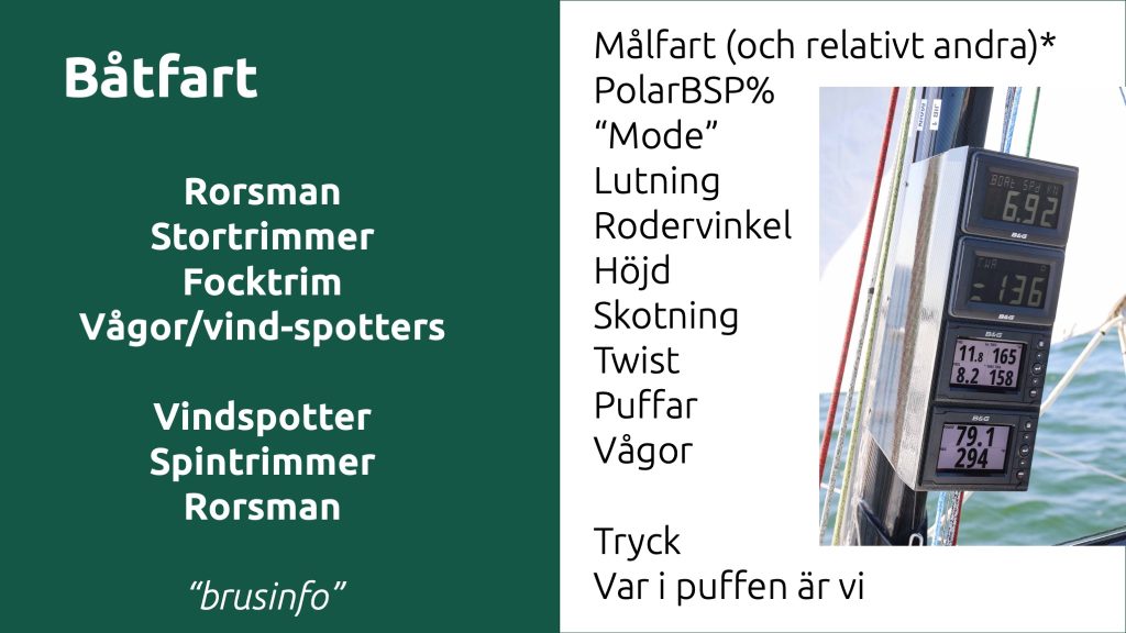 I första hand är det rorsman tillsammans med stor- och focktrim som ansvarar för att båten seglas fort. Här finns det ju många saker att prata om. Vi gillar att börja med målfart eller “target” och hur fort vi seglar mot dessa. Är vi på 100% så kan man ju ta det lite lugnt. Är vi på 95% så är det kris.