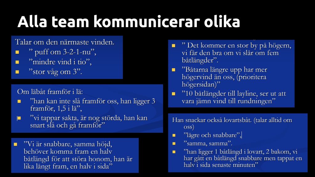 Ovan är citat från en duktig matchracingbesättning. Många halva meningar och oklarheter. Så är man ny i denna (eller vår) besättning så behöver man komma in i hur kommunikation sker i varje team, och tillsammans reda ut vad saker egentligen betyder.