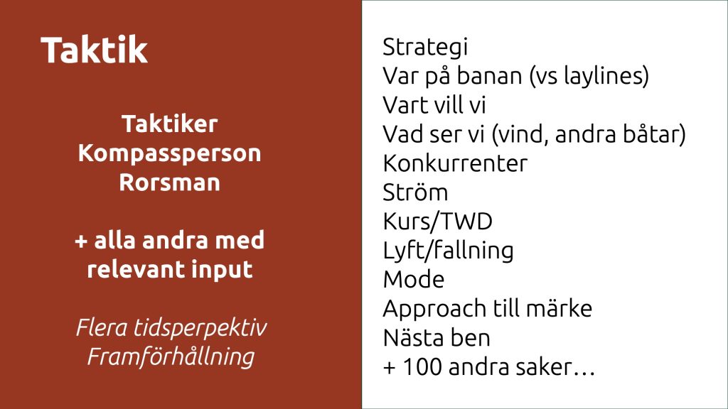 Lyssna på de olika dialogerna som sker parallellt. Taktikdiskussionen som involverar 3 personer på railen, men även rorsman och stortrimmer. Att Pelle på railen ber mig att ta det lite lugnt medans de diskuterar. Att vi ändrar beslut när vi får ny information.