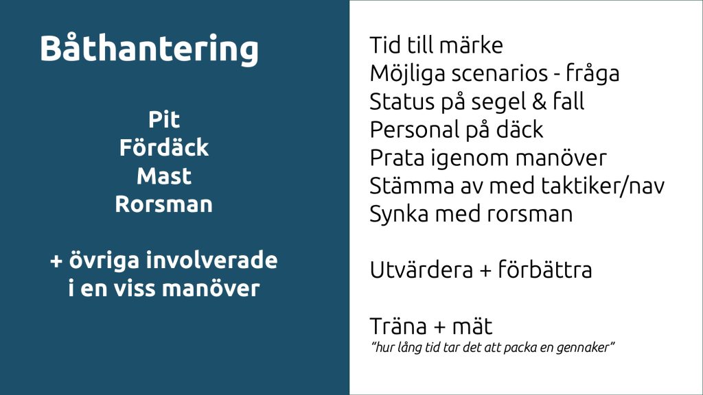 Båthantering och manövrar tycker jag skall drivas av de som gör jobbet. De har ofta tid att prata ihop sig mellan manövrar, prata scenarios och proaktivt fråga vad som kommer att hända härnäst och vad tidsperspektivet är. Att fråga rorsman eller navigatör när man inte vet borde vara naturligt? På samma sätt är det självklart att vara tydlig kring vad man behöver; “jag behöver 5 minuter för att packa om gennakern. Gör det nu innan vi kommer ut i mer vind”.